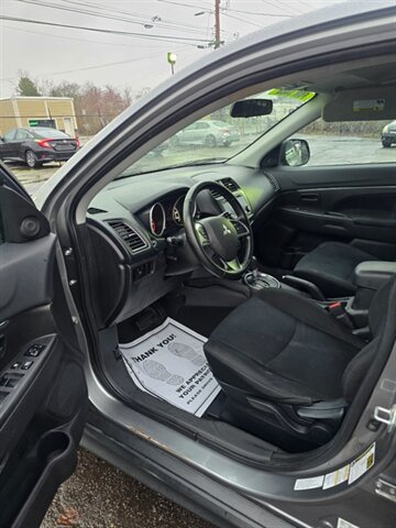 2015 Mitsubishi Outlander Sport 2.4 ES — powered by a 2.4L I4 producing 168 hp and 167 lb-ft of torque, delivering an EPA-estimated 23 MPG city and 28 MPG highway. Factory-standard features include air conditioning, cloth seating, power windows and locks, remote keyless entry, cruise control, Bluetooth hands-free and audio streaming, steering-wheel audio controls, AM/FM/MP3 audio with auxiliary and USB inputs, 60/40 split-folding rear seats and alloy wheels. Safety equipment includes ABS, electronic stability control, traction control and multiple airbags. Exterior is Gray with a Black interior; the vehicle is in excellent overall condition.