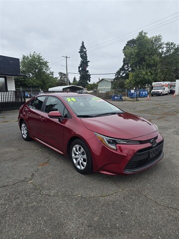 the 2024 Toyota Corolla LE, equipped with a robust 2.0L I4 engine delivering 169hp and 151ft. lbs. of torque. This sleek sedan comes in a striking Red exterior color with a refined Black interior finish. The factory default features include advanced safety technologies such as lane departure warning, adaptive cruise control, and automatic emergency braking. The interior boasts comfortable cloth upholstery, a user-friendly infotainment system with Apple CarPlay and Android Auto compatibility, and a spacious cargo area. With an impressive fuel efficiency of 32 MPG in the city and 41 MPG on the highway, this vehicle is not only stylish but also economical. Don't miss out on this excellent opportunity to drive home in a 2024 Toyota Corolla LE in pristine condition.